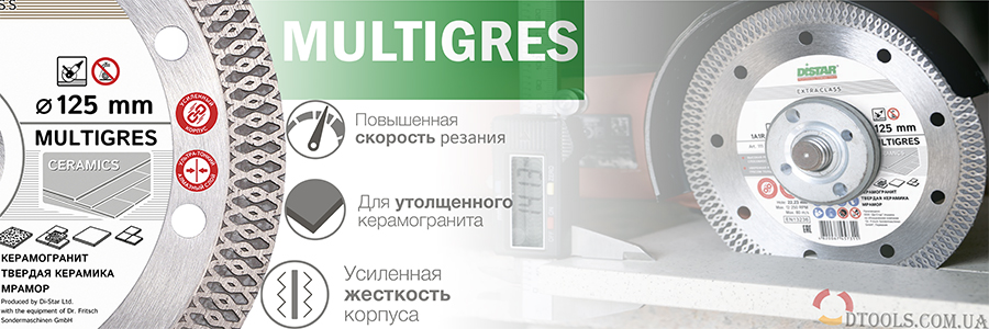 Для быстрой резки керамогранита с помощью УШМ специально разработаны круги Distar MultiGres. Это высокоскоростные диски с толщиной алмазного слоя 1,4 мм и усиленным с использованием фланца корпусом. Как и продукты серии Razor, они достаточно универсальны, могут использоваться для резки напольной и настенной плитки, керамогранита повышенной толщины до 16 мм, натурального гранита и мрамора. Позволяя выполнять резку материала при высокой скорости, они могут образовывать сколы на срезах материала. Поэтому для создания заготовок с чистыми резами такой инструмент не совсем подходит.